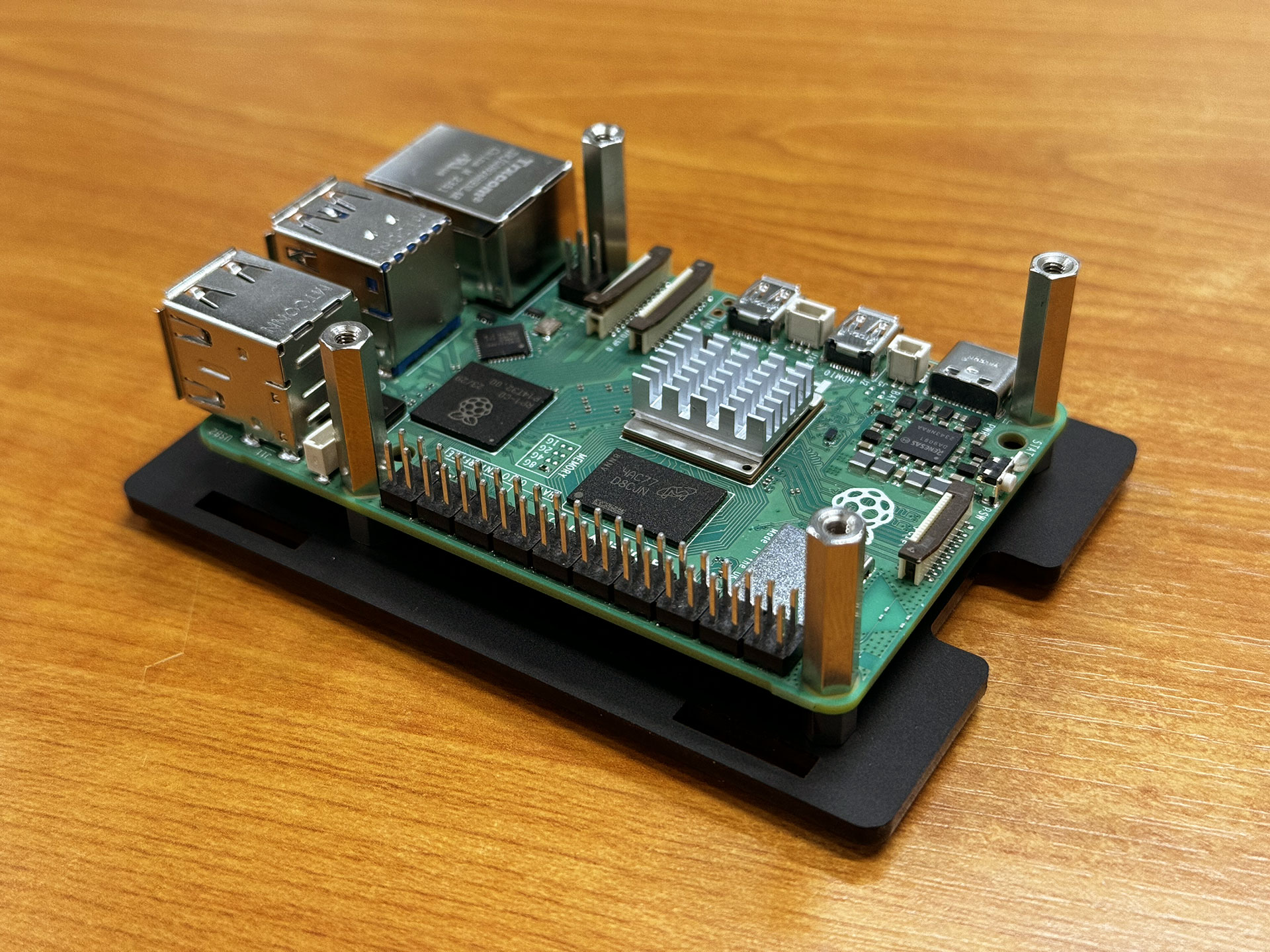 Plaats de Raspberry Pi op de afstandhouders en bevestig de 20mm afstandhouders. De inkeping van de onderplaat moet aan de achterkant zitten zodat je nog bij de microSD kunt.